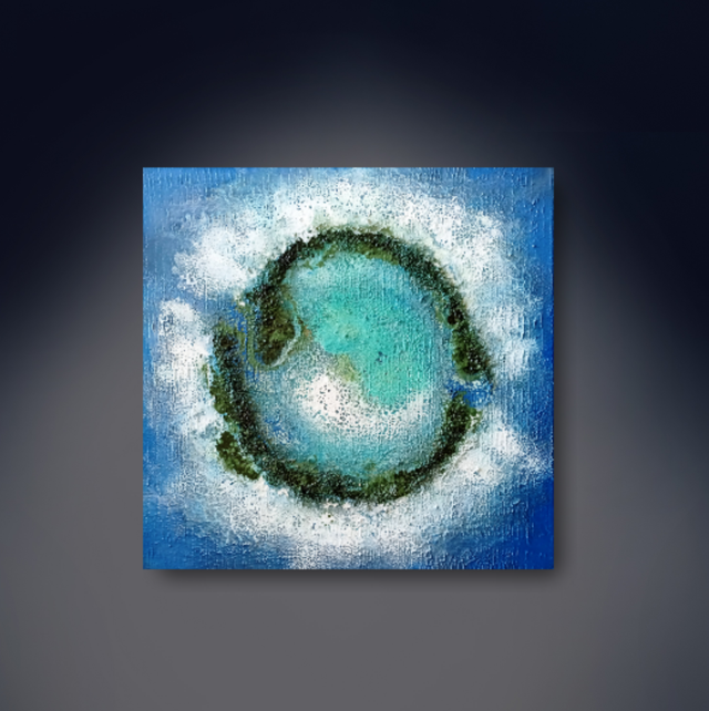 Ce tableau représente un lagon, auréolé d'une barrière minérale, les eaux cristallines se déclinent en différentes teintes de bleu et brillent sous l'effet de la lumière.