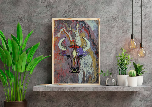 Œuvre peinte de style figuratif représentant une tête de taureau.