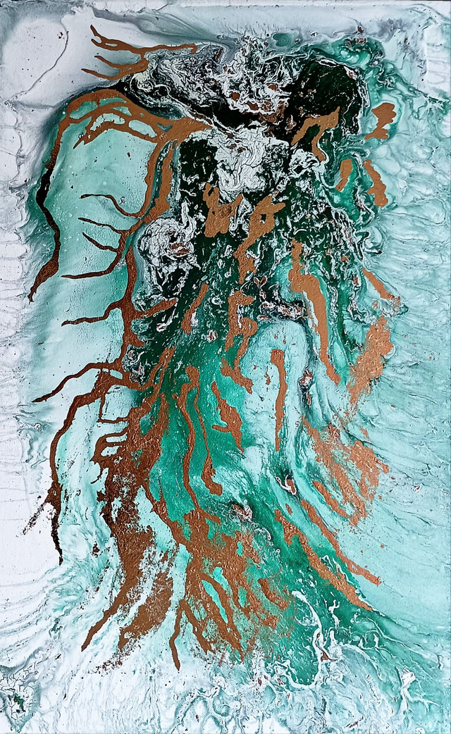 Comme dans une danse où végétal et minéral s'unissent, la feuille d'or vient former des rubans telles des lianes ou des racines imaginaires qui s'orientent à leur guise;